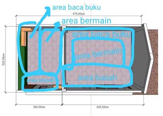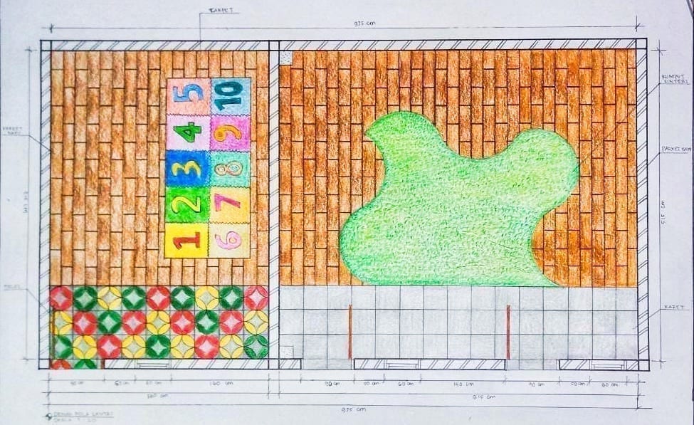 Setelah produk desain pola lantai selesai, gambar denah desain pola lantai ini disesuaikan di ruang kelas Pos PAUD Fathonah.