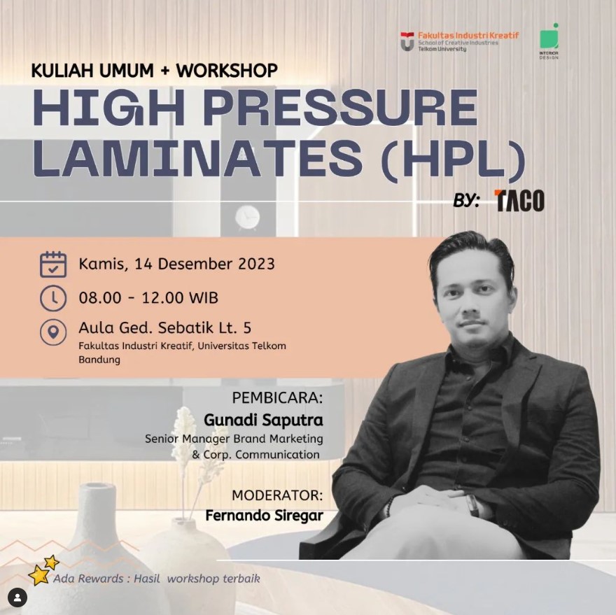 "Kuliah Umum + Workshop High Pressure Laminates (HPL) by TACO" Pembicara: Gunadi Saputra (Senior Manager Brand Marketing & Corp. Communication) Moderator: Fernando Siregar 🗓️ Kamis, 14 des 2023 🕒 8.00 - 12.00 WIB 📍Aula Gedung Sebatik FIK Lt. 5 Agenda: Product knowledge + Workshop High Pressure Laminates (HPL) Ada Rewards : Hasil workshop terbaik Free to join […]