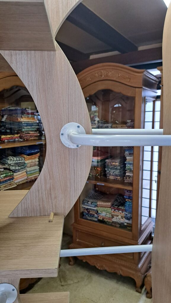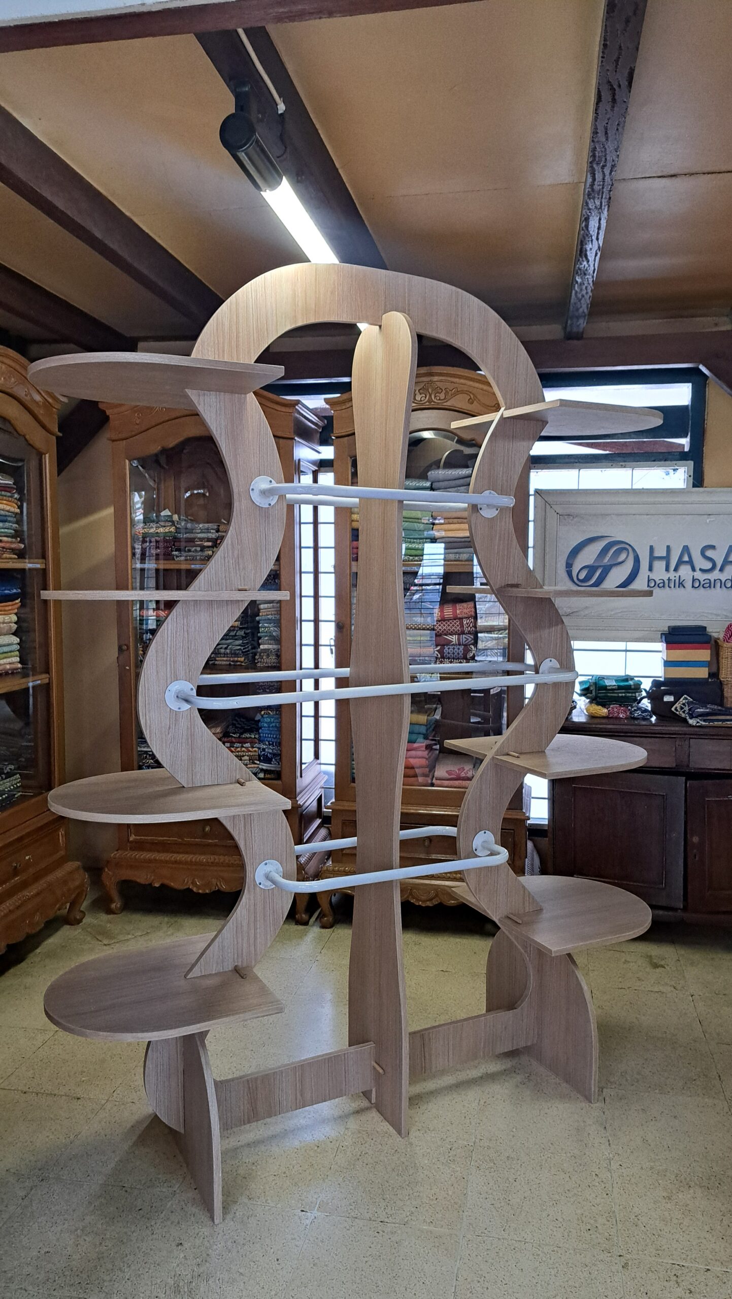 Display pameran memiliki bentuk utama yang melengkung ke atas menyerupai lekukan dan gelombang, dengan beberapa rak datar yang tersusun secara horizontal di sisi kiri dan kanan nya. Keseluruhan struktur terdiri dari beberapa unit yang saling melengkapi (modular) untuk menciptakan bentuk yang unik dan fungsional sebagai rak. Material yang digunakan adalah plywood 20mm dengan warna mengikuti tone kayu, cream beige agar memberi kesan natural alami.dan besi hollow diameter 3 cm yang diletakkan di bagian tengah yang berfungsi sebagai display kain yang digantung