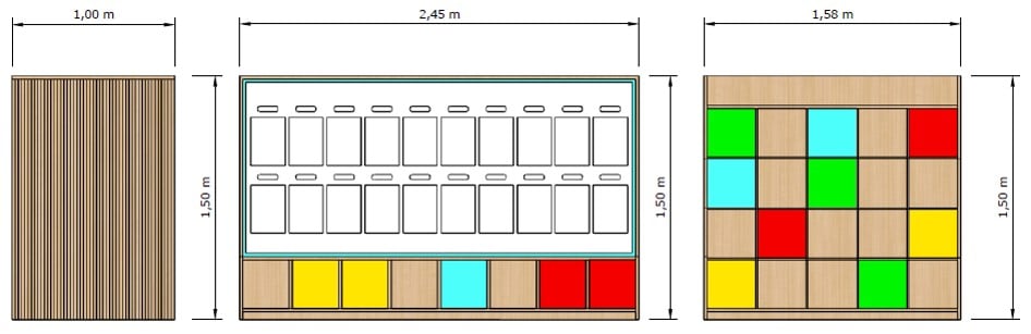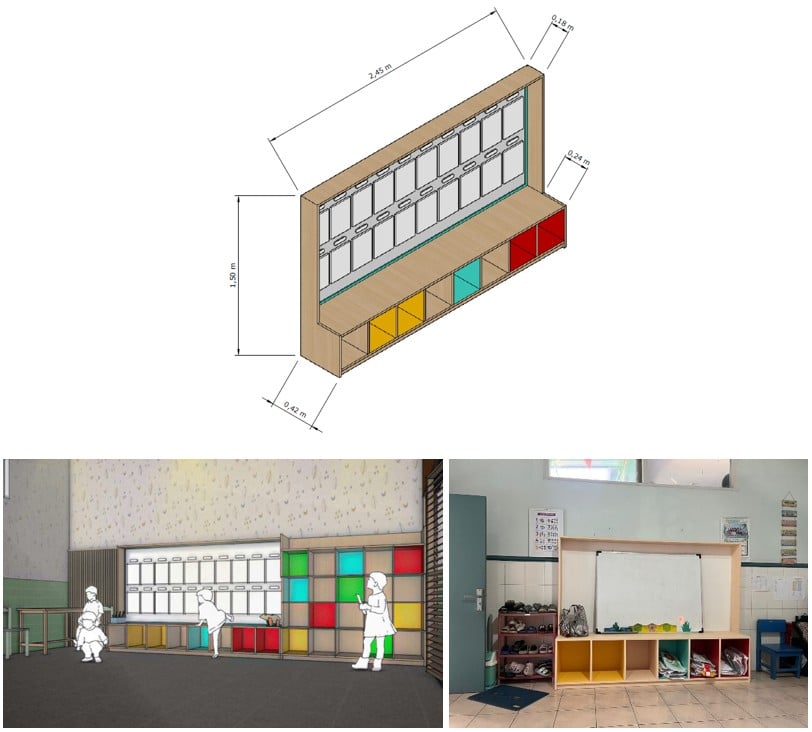 Dalam perancangannya, furnitur yang diusulkan mengintegrasikan beberapa fungsi dalam satu elemen, seperti area pajang karya siswa, panel aktivitas kreatif, serta rak penyimpanan barang pribadi anak. Furnitur dirancang dengan mempertimbangkan aspek ergonomi anak usia dini, keamanan material, kemudahan perawatan, serta fleksibilitas penggunaan. Pemilihan warna cerah digunakan sebagai elemen visual yang mampu menciptakan suasana belajar yang menyenangkan tanpa memberikan distraksi berlebih terhadap kegiatan belajar mengajar.