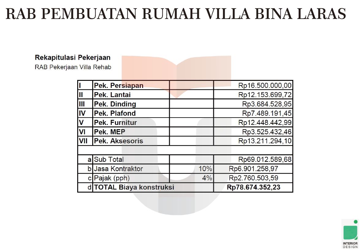 Tidak hanya visualisasi, tim abdimas juga memberi tambahan karya pada mitra berupa RAB untuk memudahkan realisasi perancangan ini kedepannya. RAB yang dirancang tidak hanya interior saja melainkan terdapat perhitungan konstruksi bangunan. Namun angka yang ada perlu dikaji ulang menyesuaikan harga yang sedang popular saat ini (Gambar 6).